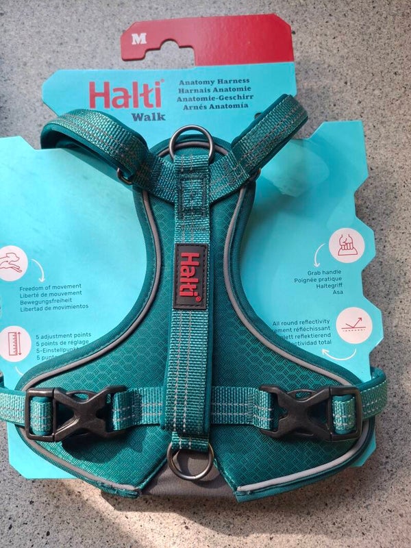 Conçu pour privilégier le confort, le harnais Halti Anatomie possède un design unique, développé à l’issue de recherches scientifiques pour s’adapter à la morphologie du chien. Voici les principales différences : Répartition de la pression : Contrairement à d’autres harnais qui utilisent des brides étroites et exercent une pression marquée sur de petites zones du corps, le harnais Halti Anatomie comprend des empiècements échancrés et matelassés au niveau du dos et du poitrail. Ces pièces matelassées répartissent la pression plus uniformément sur une surface plus large, pour améliorer le confort et la sécurité. Triangle en néoprène Flex : Le triangle en néoprène Flex, situé à la base de l’empiècement dorsal, permet au harnais d’épouser le corps de votre chien à chaque mouvement, pour plus de confort et de flexibilité. Sangles de cou articulées : Au lieu de former une boucle continue, les sangles de cou du harnais Halti Anatomie sont articulées. Ce design assure une parfaite liberté de mouvement et un confort optimal en permettant au harnais de bouger avec le cou de votre chien. Facile à régler : Le harnais comprend cinq points de réglage (soit un de plus que les harnais ordinaires) pour s’adapter avec précision à la morphologie unique de votre chien. Tous ces atouts font du Halti Anatomie l’un des meilleurs harnais qui soit pour les promenades et la course à pied, offrant à la fois confort et fonctionnalité.