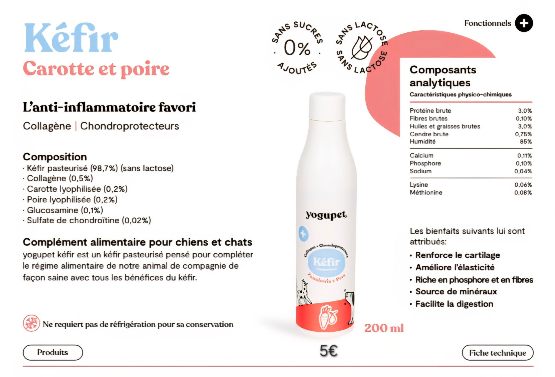 Le Kéfir sans lactose pour chien et chat de Yogupet est riche en calcium et est entièrement adapté pour répondre aux besoins de nos protégés. Cette recette à la carotte et à la poires est idéale pour varier les plaisirs gustatifs de votre animal. Et il présente de nombreux avantages.