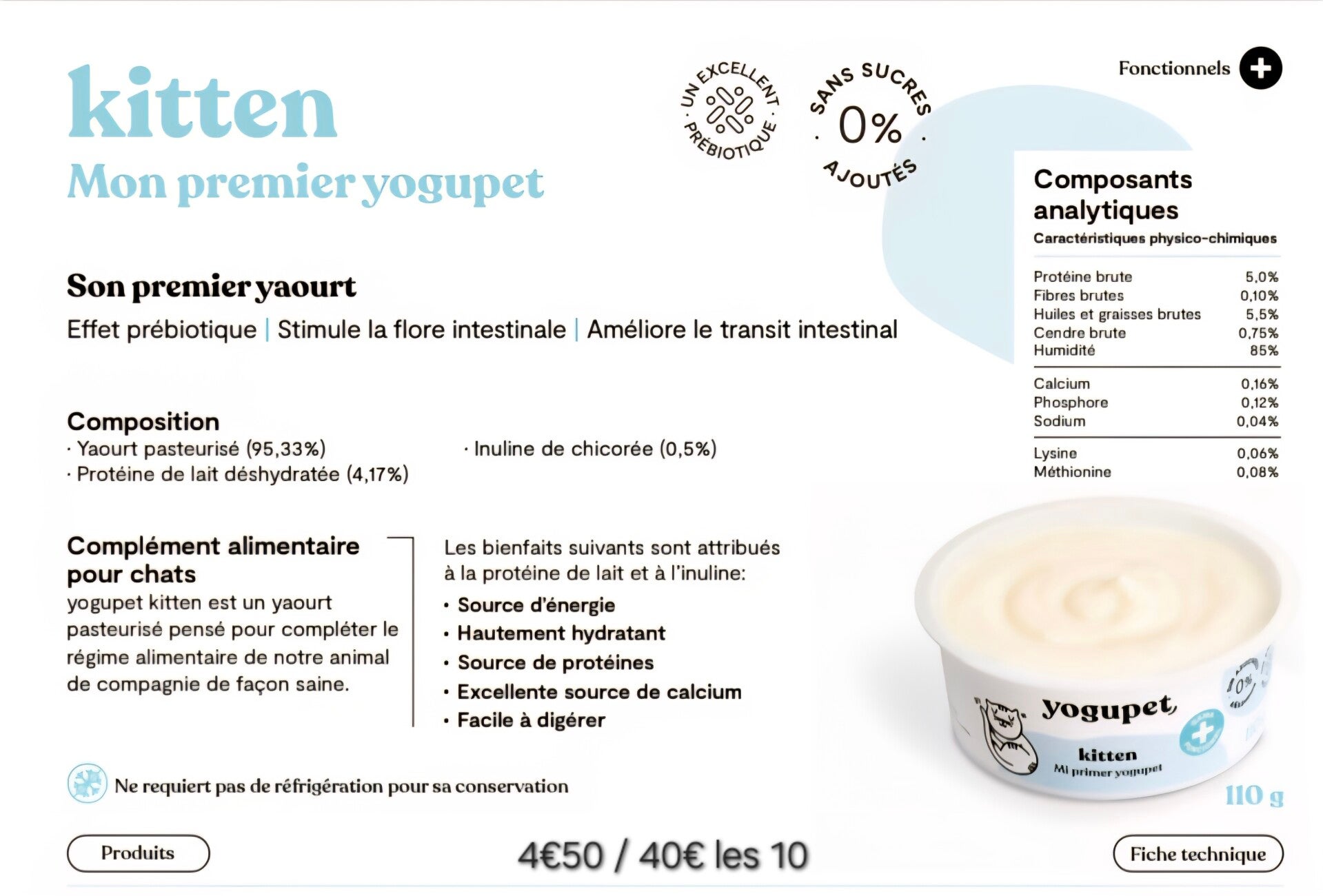 Riche en calcium et protéines de lait il est parfaitement adapté pour répondre aux besoins des chatons. Cette recette est composée de Yaourt pasteurisé, de protéines de lait et d'inuline de chicorée.